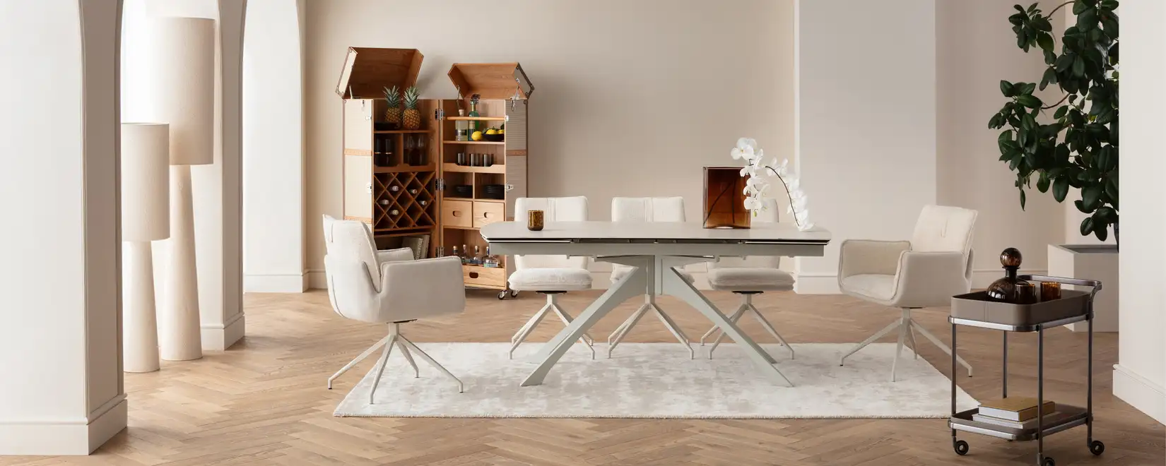 Cloud Dancer zeigt seine Wirkung nicht nur an Wänden. Durch sorgfältig ausgewählte Möbel und Accessoires, die den sanften Weißton aufgreifen, entsteht ein Raumgefühl von Ruhe und Leichtigkeit. In der Wohnzone bringen helle Polster und weiche Formen eine entspannte, offene Atmosphäre. Im Essbereich sorgen helle Oberflächen und dezente Materialien für Klarheit und Harmonie.