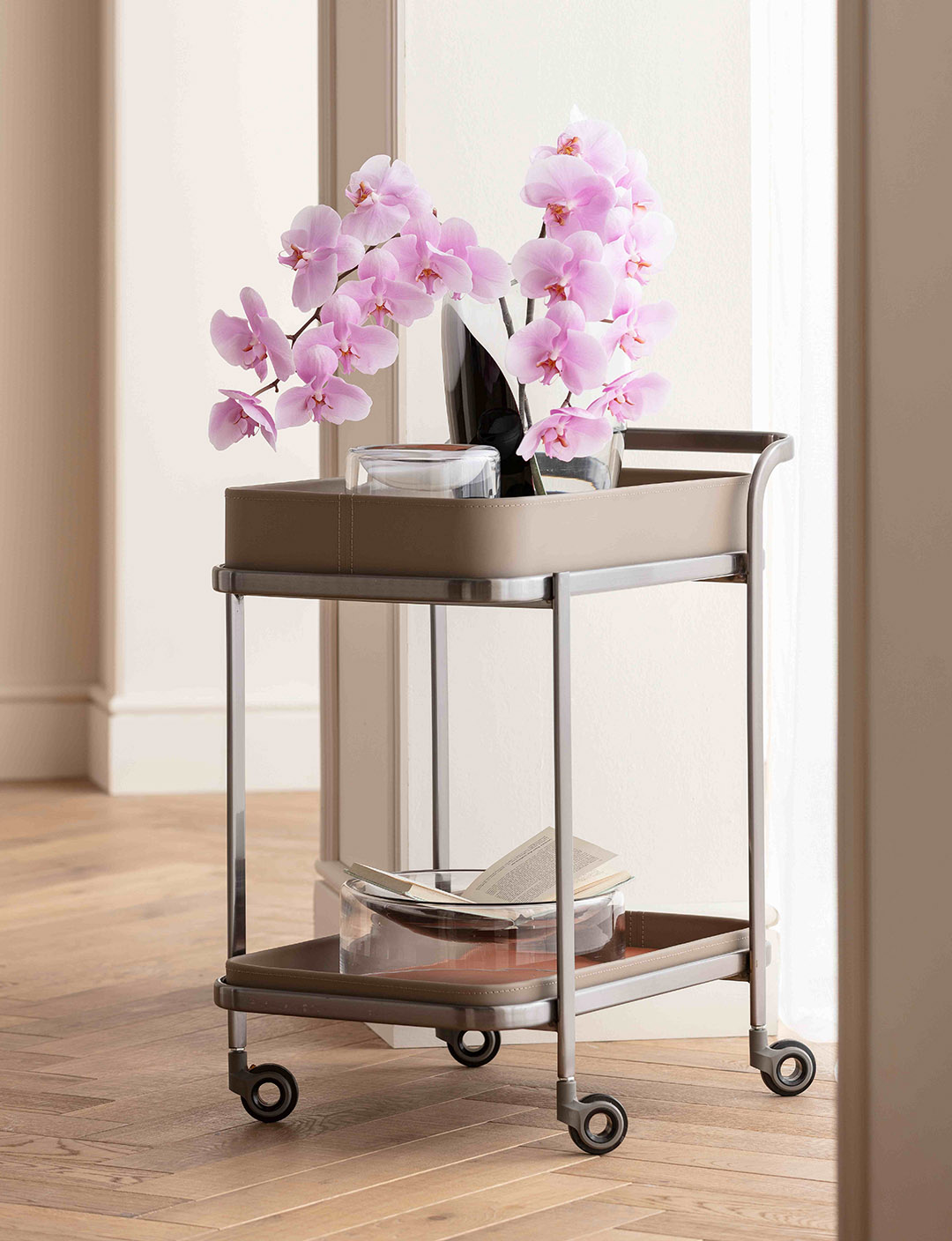 Ob als schicker Barwagen mit Gläsern und edlen Tropfen, als praktische Ablage in der Küche oder stilvolle Organisation im Bad – dieser mobile Servierwagen der Serie Tango bringt Flexibilität und Charme in jeden Raum.